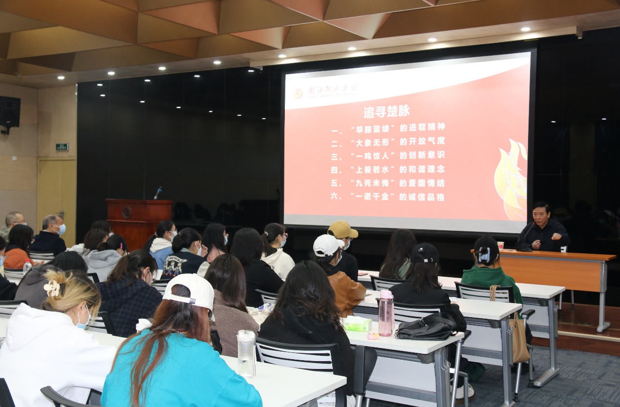 刘教授首先开宗明义,阐明本次讲座的初衷。他以习近平总书记对楚文化的高度评价谈起,强调学习楚文化的重要性和必要性。接着,刘教授从“楚国八百年”的宏阔历史出发,将“楚脉”即具有标志性意义的楚文化概括成六个方面,分别是“筚路蓝缕”的进取精神、“大象无形”的开放气度、“一鸣惊人”的创新意识、“上善若水”的和谐理念、“九死未悔”的爱国情结和“一诺千金”的诚信品格。他对这六类标志性楚文化的历史背景、文本渊源、深刻内涵和当代意义进行了详细解读,同时穿插生动有趣的历史故事辅以说明。“筚路蓝缕”的进取精神诠释了楚人艰苦奋斗、开疆拓土的光辉历程,让楚国由最早方圆50里的小国变成五千里的“千乘之国”;“大象无形”的开放气度体现为楚人开阔的视野、开放的心胸和开明的态度,看轻个人尊严、看重国家利益;“一鸣惊人”的创新意识在楚庄王身上得到突出体现,并催生青铜器、漆木器、丝绸、老庄哲学、屈宋文学和美术乐舞这六类重大性的物质和精神文明创新成果;“上善若水”的和谐理念展示出楚文化宽容和毅力兼具的品性,如楚庄王与晋国交战中“止戈为武”的故事;“九死未悔”的爱国情结不仅以伟大的爱国主义诗人屈原为代表,更体现在众多普通楚人身上,如楚国屠夫屠羊说在逃亡途中舍身救下楚昭王的故事;“一诺千金”的诚信品格以楚人季布为典型,其以侠肝义胆赢得天下人的尊敬,“宁要季布一诺,不要黄金千两”即出自他的人生故事。最后,刘教授结合“楚脉”中所蕴含的正能量,对学生们提出殷切期望。