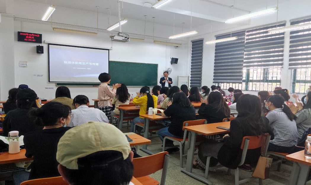 在web3.0时代,新闻是如何生产的?邓老师向同学们展示了湖北广电融媒体新闻中心的宣传视频,对区块链新闻编辑部的运作模式进行了简要介绍,并分享了自己在BBC的交流见闻。他鼓励同学们珍惜新闻学这个专业,“可能技能恐慌,不能不去培养。内容为王,策划能力、写作能力和调查能力始终是最重要的能力。”作为新闻人,要勇于吐故纳新,为新时代中国特色社会主义建设贡献青春力量。邓老师的生动讲述激发了大家的兴趣,新闻1941班学生魏文婕表示,日后会特别关注新闻业的最新进展。