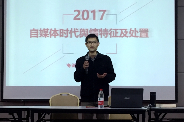 马主任围绕网络舆论概况、自媒体环境下的舆论困局、舆情的处理要点三个方面向同学们阐述了自媒体时代舆情特征与处置的相关内容。马主任对“互联网+”时代的受众特点及我省情况进行分析,指出如今舆情年轻化显现,网络、手机等为载体的新兴舆论场为年轻人所控。随后对舆情的基本概念进行解读以及常见的舆情管理困局进行介绍,告诉同学们要搞懂的是舆情在哪里,要明确的是舆情到哪里去。他指出通常情况下舆情处置分发声、追责、善后三步走,其中发声是还原真相的必要手段。